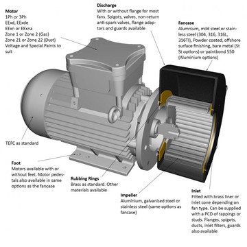 Single inlet backward bladed/radial bladed or curved forward bladed, ATEX rated centrifugal fans. ACI's ATEX approved fans can be Stainless Steel, Mild Steel or Aluminium.